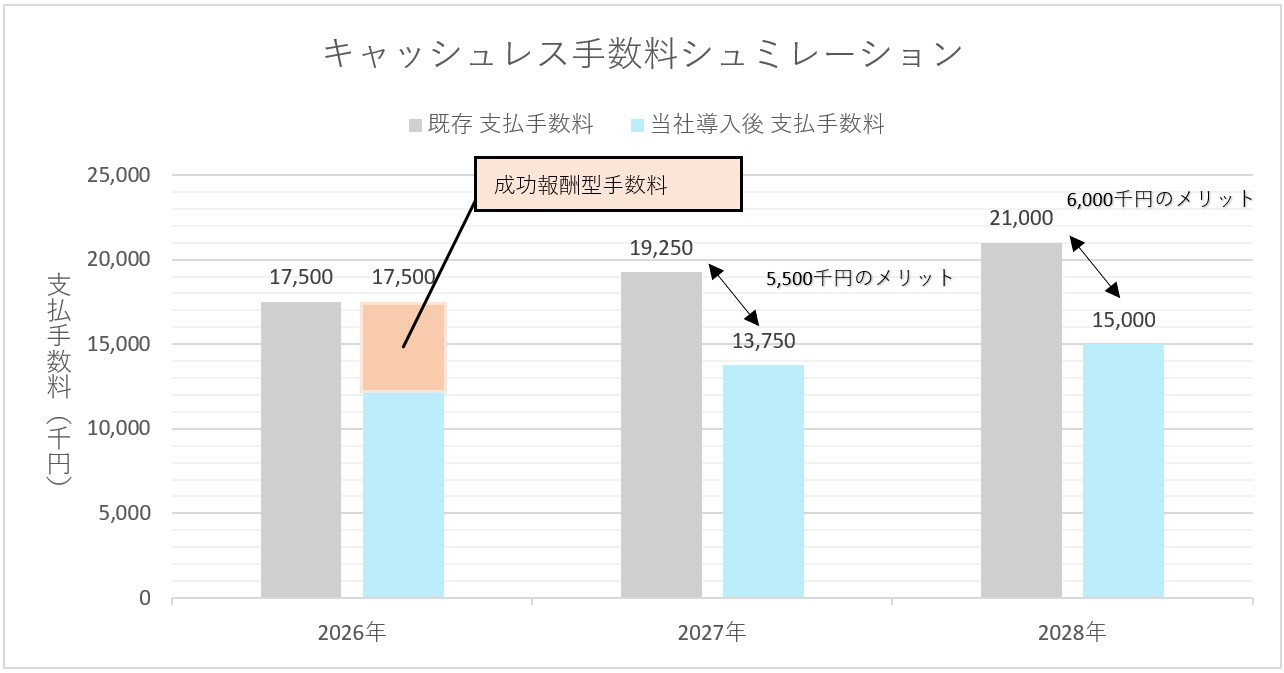 【(例)シュミレーション 想定条件】 キャッシュレス売上高:2026年 500百万円 2027年 550百万円 2028年 600百万円 既存手数料率:3.50% 当社コンサル導入後手数料率2.50%(▲1.00%) ※キャッシュレス市場拡大に伴い取扱高は増加を想定